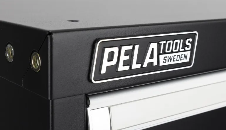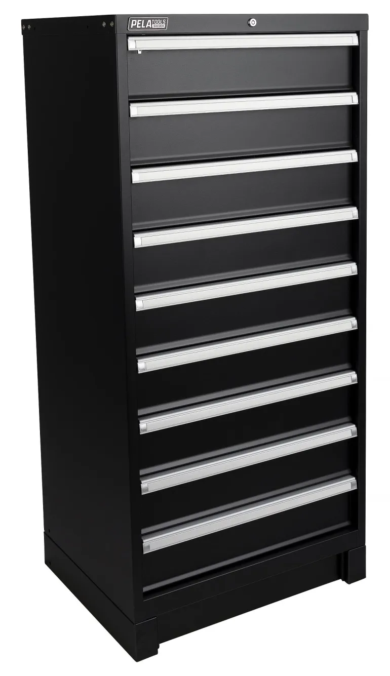 Pela 533584 on vankka työkalulaatikosto, jossa on 9 ulosvedettävää laatikkoa (kapasiteetti 75 kg per laatikko). Mustaksi lakattu pinta ja hopeanväriset yksityiskohdat sopiakseen yhteen Pela 509665-työpajakalusteen kanssa. Kaatumisenestojärjestelmä mahdollistaa vain yhden laatikon avaamisen kerrallaan ja kaikissa laatikoissa on vedinlistassa lukitussalpa, joka estää laatikoiden tahattoman avautumisen. Koko laatikosto on lukittavissa avaimella työkalujen turvallista säilytystä varten. Vedinlistoissa on paikat merkinnöille.