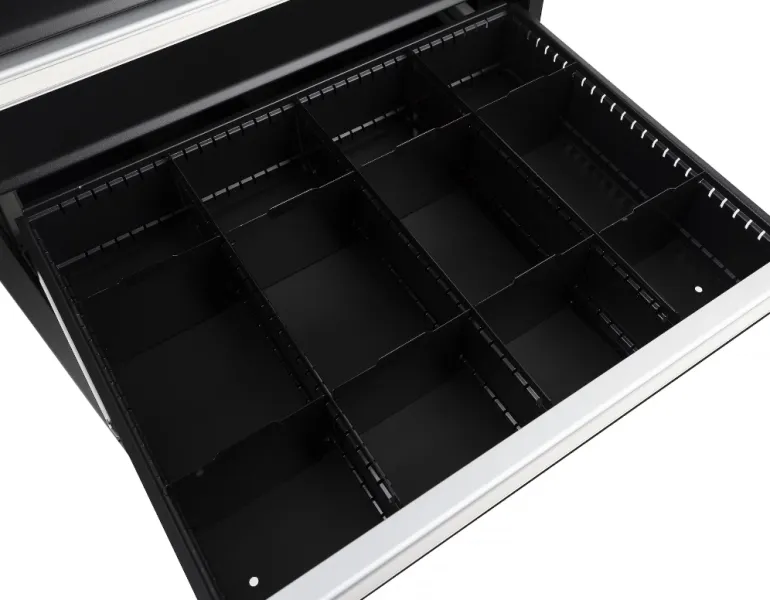 Vankka työkalulaatikosto, jossa on 9 ulosvedettävää laatikkoa (kapasiteetti 75 kg per laatikko). Mustaksi lakattu pinta ja hopeanväriset yksityiskohdat.