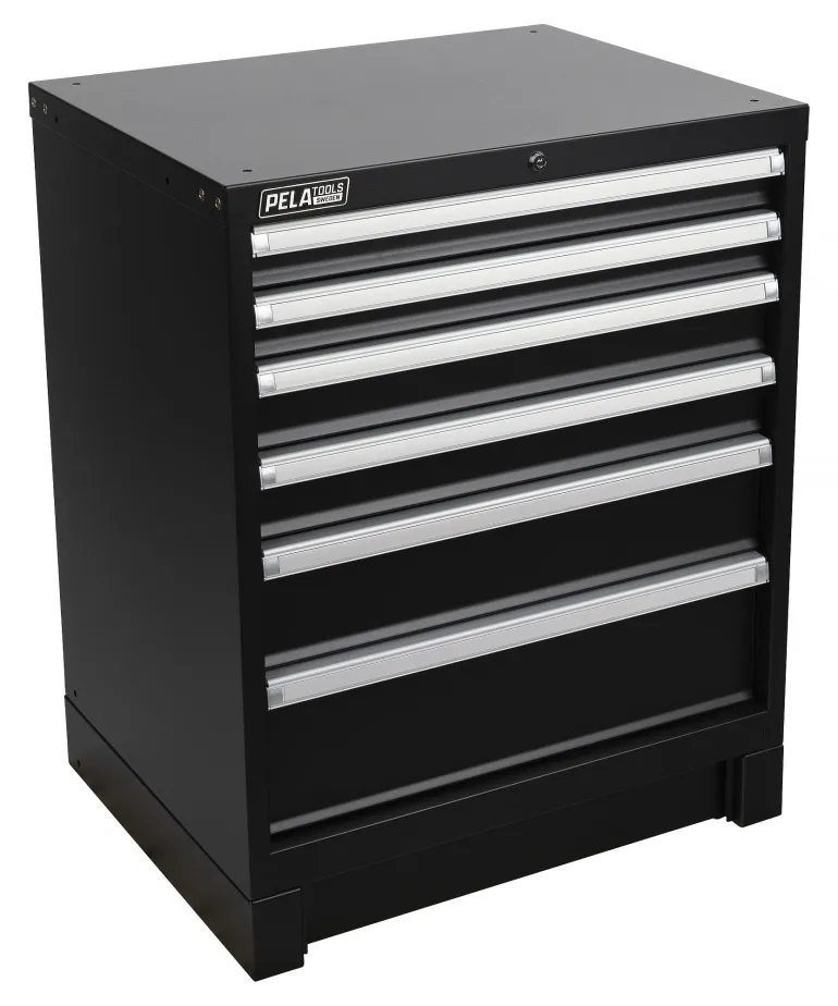 PELA 537741 on vankka työkalulaatikosto. Mustaksi lakattu pinta ja hopeanväriset yksityiskohdat. Sopii PELAn työpajakalusteeseen (509665). 6:lla ulosvedettävällä laatikolla, joista 5 kestää 75 kg:n kuormituksen ja 1 200 kg:n kuormituksen. Kaatumisenestojärjestelmä mahdollistaa vain yhden laatikon avaamisen kerrallaan ja kaikissa laatikoissa on kahvassa lukitussalpa, joka estää laatikoiden tahattoman avautumisen.