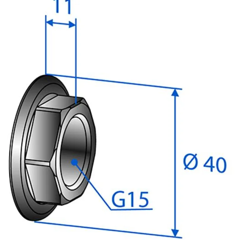 Laippamutteri liitäntäkytkentään. Sisäkierre G15, halkaisija 40 mm.