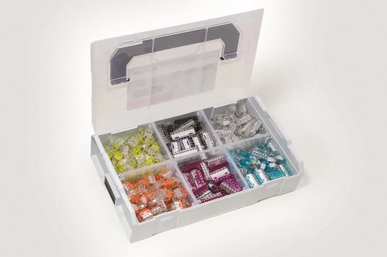 Käytännöllinen laatikko, HelaCon Plus Mini Variobox, sisältää kaikki koot (yhteensä 350 liitintä). HelaCon-huppuliittimiä käytetään kaapelien nopeaan, helppoon ja luotettavaan liittämiseen työntötekniikan avulla ilman työkaluja. HelaCon Plus Minissä on uusinta teknologiaa– kaksinkertainen lukitusjousi, joka helpottaa liittämistä ja lisää turvallisuutta. Läpinäkyvät ja värikoodatut kytkentäliittimet kiinteille ja monilankaisille johtimille. Samaan liittimeen voi liittää 0,5–2,5 mm²:n johtimia. Kuorintapituus 11 mm. Enimmäisjännite 450 V. Enimmäisvirta 24 A. Lajitelmalaatikko sisältää seuraavat liittimet: 100 x HCPM-2, 80 x HCPM-3, 60 x HCPM-4, 50 x HCPM-5, 40 x HCPM-6 ja 20 x HCPM-8