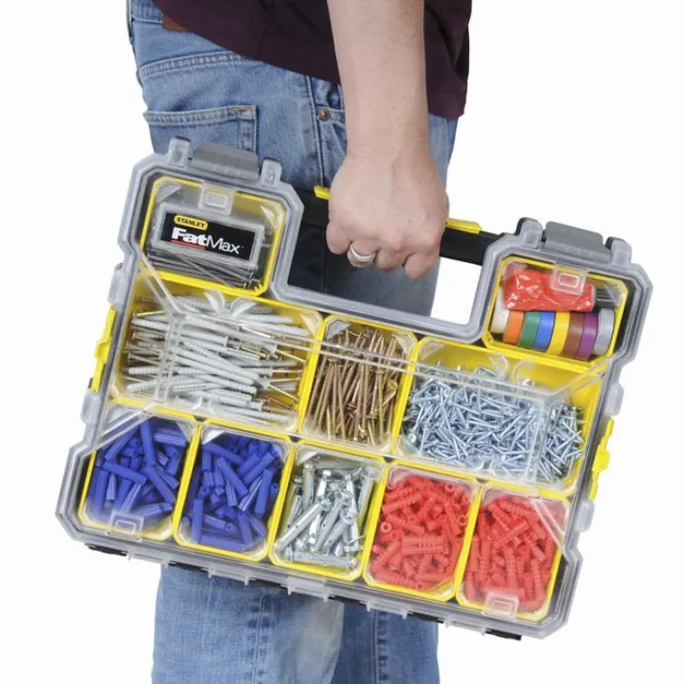Lajittelulaatikossa on tukeva kahva ja vahvat kiinnittimet sekä kiinteä leveä kahva, joka mahdollista helpon ja turvallisen kuljetuksen. Irrotettavat lokerot ja laatikot pienten osien ja tarvikkeiden säilytykseen. Murtumattoman kannen ainutlaatuinen rakenne – lukitsee tiiviisti kaikki lokerot. Leveät sivukiinnittimet mahdollistavat tukevan pinonnan.
