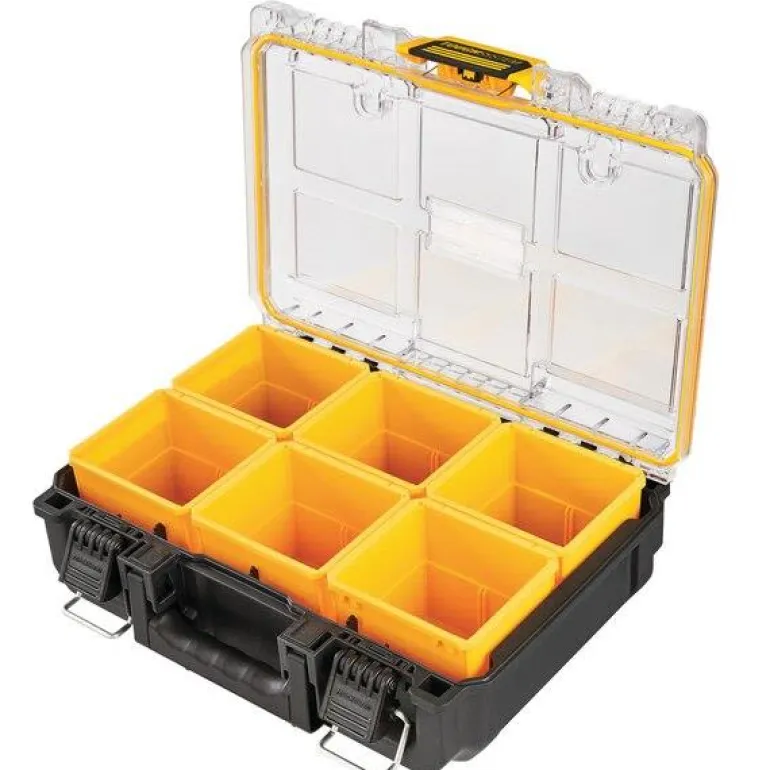 Syvä säilytyslaatikko ja ToughSystem 2.0. Laatikossa on 6 irrotettavaa lokeroa, jotka voidaan poistaa joustavuuden lisäämiseksi tai järjestää tarpeen mukaan. Suojausluokituksen IP65 ja polykarbonaattikannen ansiosta sisältö on turvassa.