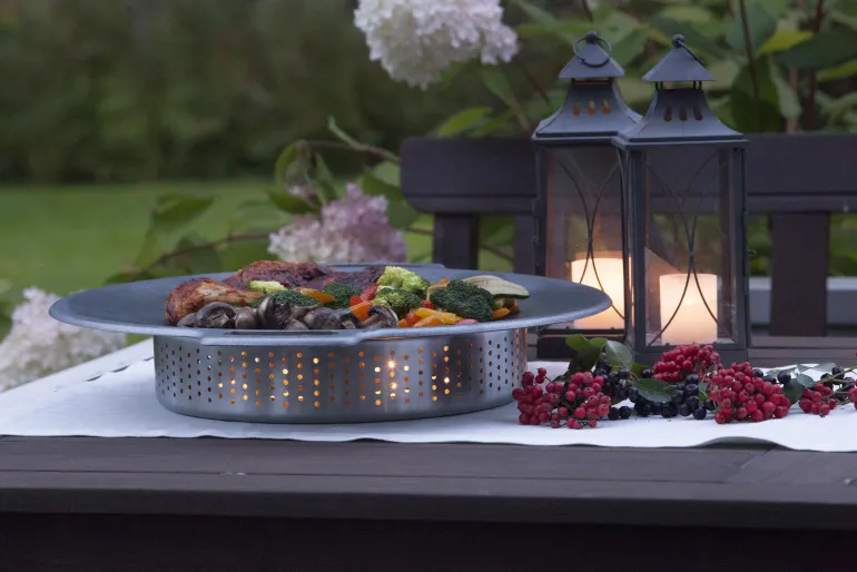 Teräksinen lämpöalusta erilaisille Muurikka-pannuille. Tarjoile ruoka suoraan pannulta, nosta pannu pöytään lämpöalustan päälle. Lämmönlähteenä toimivat tuikkukynttilät (eivät sisälly toimitukseen). Halkaisija 32 cm.