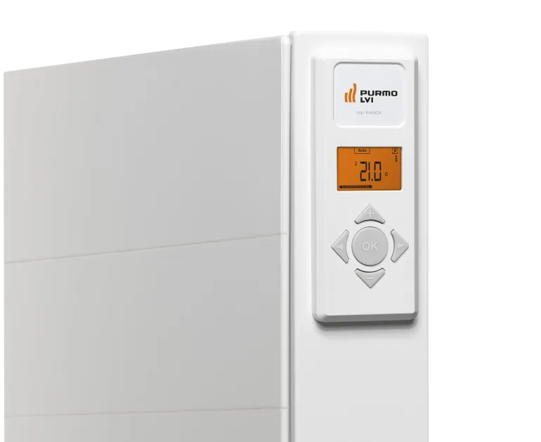 Yali Ramo, öljytäytteinen sähköpatteri, tasainen etuosa, vaakaviivat, LVI:ltä. Digitaalinäytöllä varustettu elektroninen termostaatti.