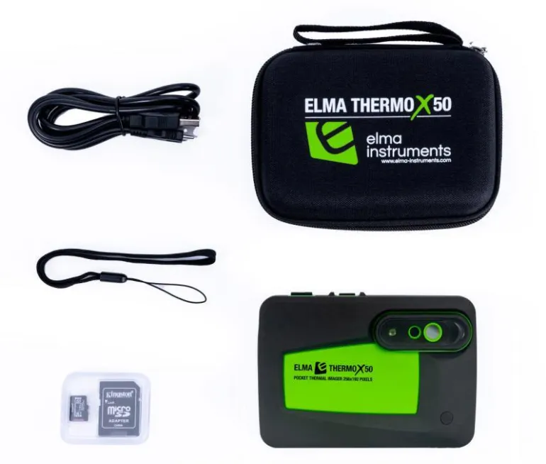 Elma Thermo X50 toimitetaan käyttövalmiina laatikossa sisältäen USB Type-C -kaapelin, 32 Gt:n SD-kortin, rannehihnan ja käyttöohjeen.