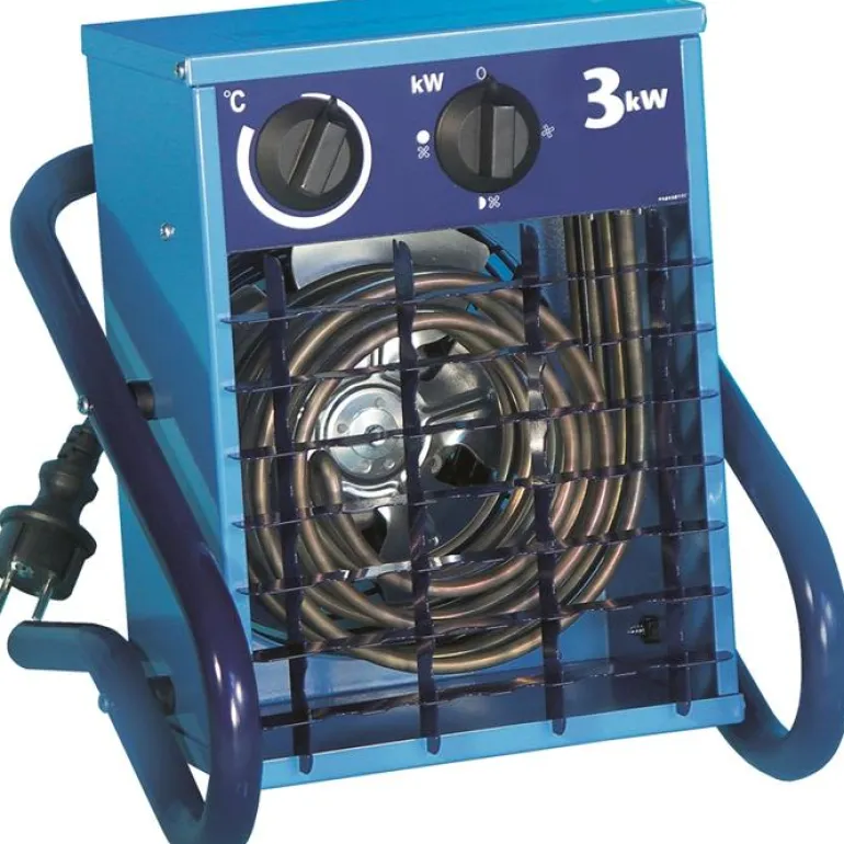 El-Björn VF 31 3,3 kW:n lämmityspuhallin. Ilmavirtaus 250 m³/h. Portaaton termostaatti lämmityksen ja puhaltimen ohjaukseen.