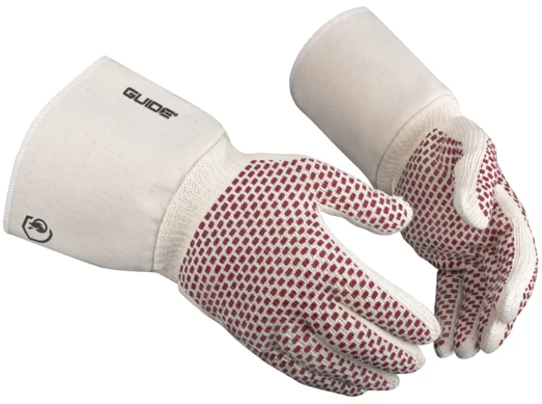 Guide Gloves 3553 on puuvillainen kuumuudensuojakäsine nitriilikuvioinnilla käden molemmin puolin, mikä antaa hyvän otepidon ja kestävyyden. Käsineessä on pitkä ranneke, ja se on hyväksytty jopa 250 asteen kosketuslämmölle.