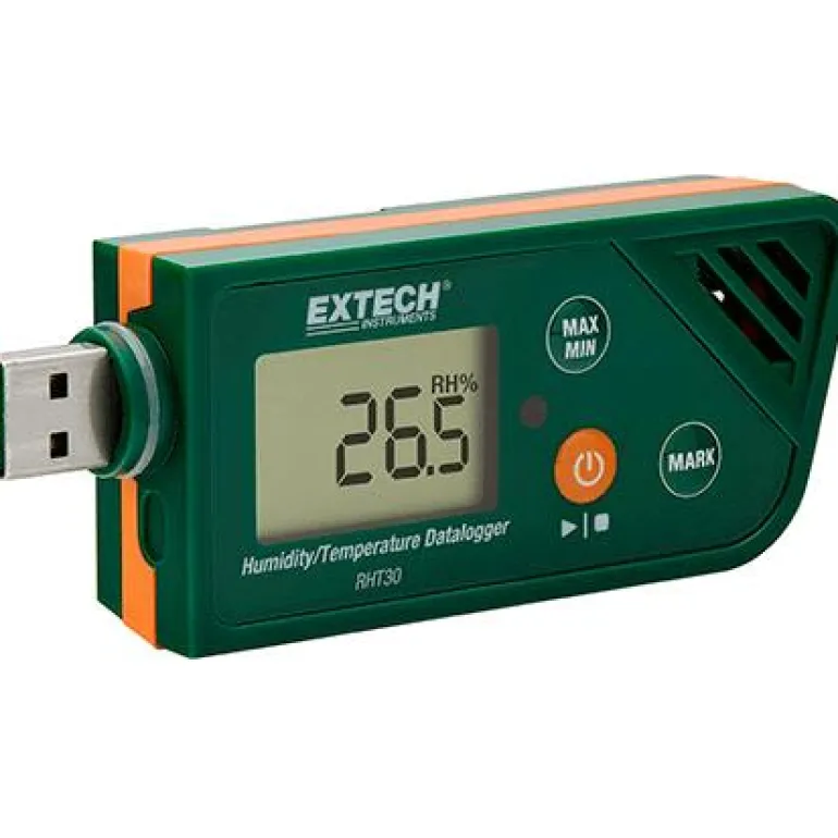 Extech RHT30 on lämpötila ja RH-loki, sisäinen muisti 4800 mittaustulokselle. Mittaustulokset voi siirtää helposti tietokoneelle PDF tai excel -muodossa. Suuri LCD-näyttö.