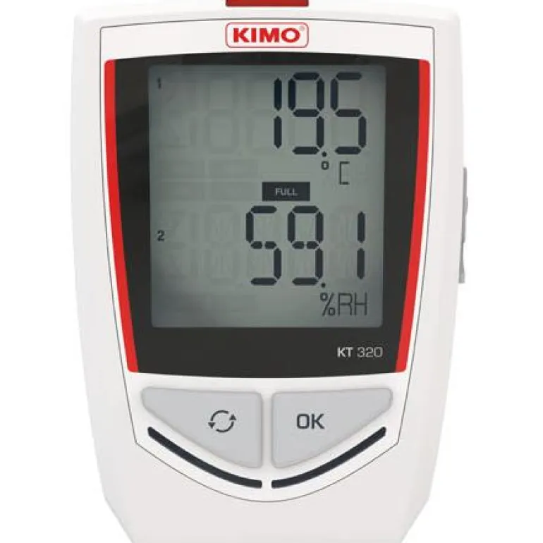 Kimo KT320 on lämpötilaloggeri, jossa on kaksi ulkoista kanavaa eri mittauksille: lämpötila, kosteus, mA, mV ja pulssi. Muisti 2 000 000 mittausarvolle.