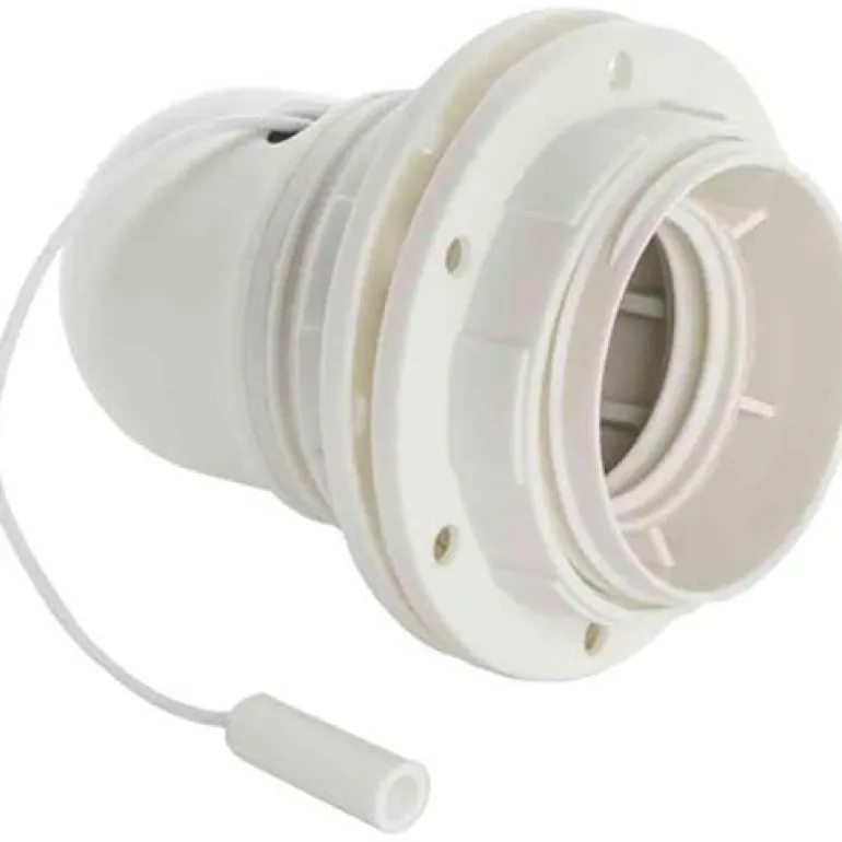 Kierteellinen lampunpidike vetokytkimellä, sopii esimerkiksi pöytä- ja kattovalaisimille. Mukana 2 varjostinrengasta ja eristyssarja.
