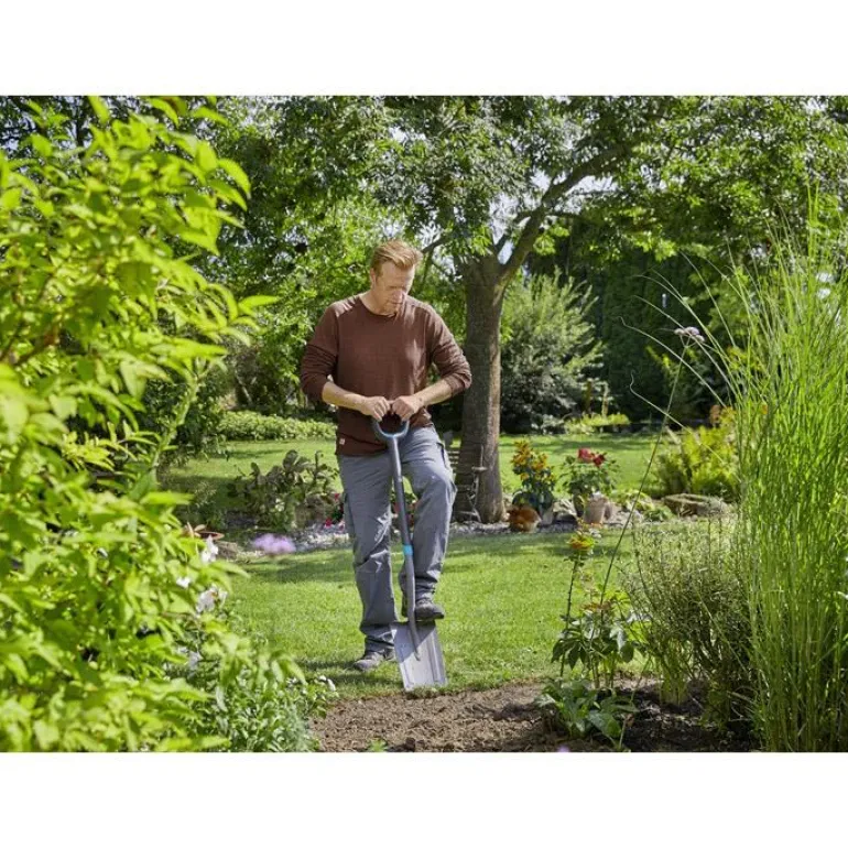GARDENA ErgoLine on kätevä lapio maan kääntämiseen, kaivamiseen, muokkaamiseen ja siirtämiseen. Erikoisleveästä ja ergonomisesti muotoillusta D-kahvasta saa mukavan otteen kahdella kädellä, mikä helpottaa työskentelyä. Varren soikea muoto estää kahvan tahattoman kääntymisen. Pidennetty muovipinnoite takaa hyvän pidon ja mukavan käsittelyn ilman otteen lipsumista. Erittäin terävä teräosa on karkaistua laatuterästä. Erikoisleveä kuvioitu jalkatuki vähentää luistamista ja mahdollistaa optimaalisen voimankäytön maata kaivettaessa.