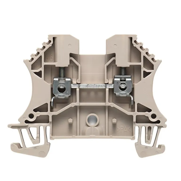 Weidmüller WDU 2.5 -läpivientiliitin Plint W -sarjasta. Kiinnityssanka ja ruuvi on valmistettu teräksestä, kun taas johdinkisko, joka on päällystetty tinaa olevalla lyijykerroksella, on valmistettu kuparista.