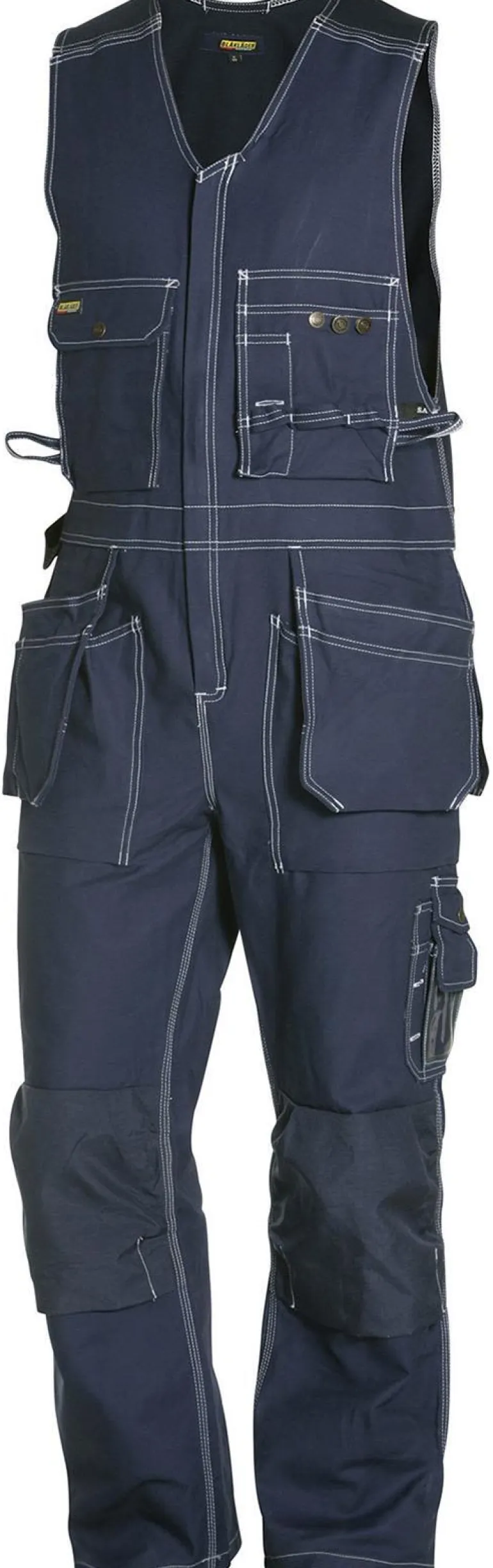 Lappuhaalarit, joissa joustava selkäosa ja CORDURA®-vahvikkeet polvissa ja takataskuissa, säädettävä olkasauman kohdalta, vasaralenkki sivulla. Metallinapit, sisäsaumassa kolmipisto-ommel, piilotettu yksisuuntainen muovivetoketju. Reisitasku, jossa kynätasku, puhelintasku ja henkilökorttitasku, rintataskut – vapaasti riippuvat painonapeilla ja turvanauhoilla, toisessa läppä ja toisessa kynätasku, patenttinapit ja puukkopidike. Laskokselliset etutaskut, polvisuojataskut kahdella säätömahdollisuudella, naulataskut – voidaan työntää laskoksellisiin etutaskuihin, takana naulataskut Puhelintasku, taittomittatasku, jossa puukkopidike ja kynätasku. Materiaali: 100 % puuvillaa, twill, 370 g/m².