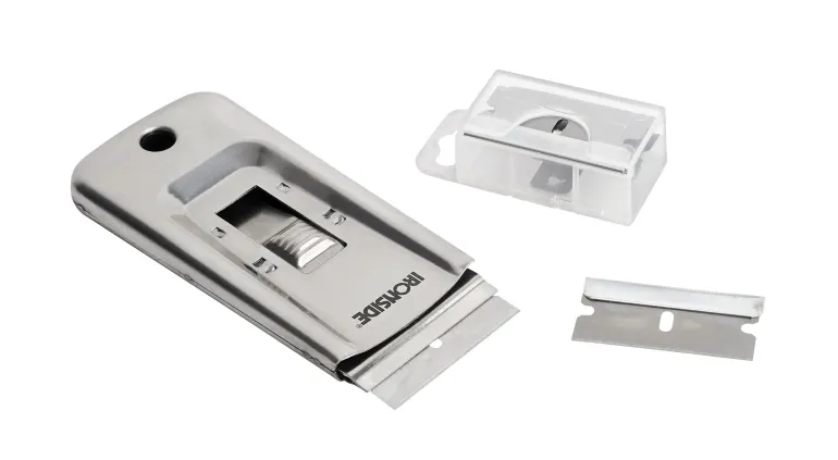 Nikkelöity. Puristettua levyä. Ulos liukuva terä. Mukana viisi terää.