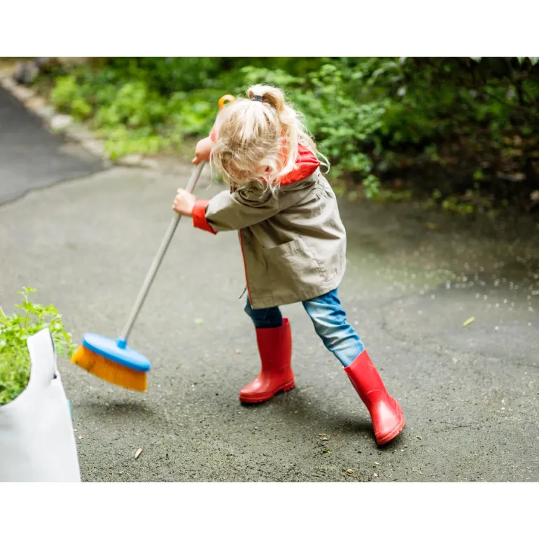 Varsi kestävästä anodisoidusta alumiinista. Harja paksulla mutta pehmeällä muovimateriaalilla on mukava käyttää. Tyypillinen oranssi kahva on suunniteltu pienille käsille.