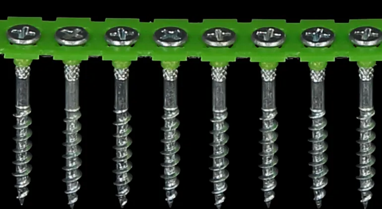 Kiiltosinkitty ja nauhoitettu lastulevyruuvi käytettäväksi kantavissa puurakenteissa. Ruuvissa on Philips-ristiura PH2.