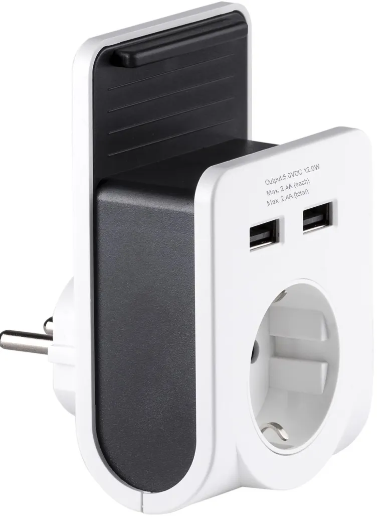 Laturi esim. matkapuhelimelle. Laturissa on 2 USB-liitäntää ja 230 V:n pistorasia (16 A, maks. 3680 W). Sisäänrakennettu teline pitää matkapuhelimen turvallisesti paikallaan. Antaa yhteensä 2,4 A (enintään 2,4 A/portti).