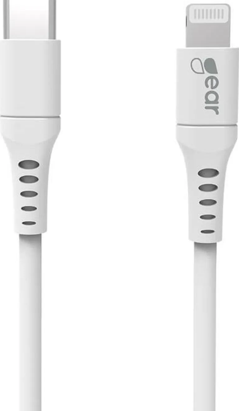 GEAR 665104 on 2 metrin latauskaapeli USB-C Lightningiin. C94-sirulla PD-latausta varten ja MFI (Made for iPhone). Latauskaapeli on valkoinen ja tukee 18 W:n pikalatausta.