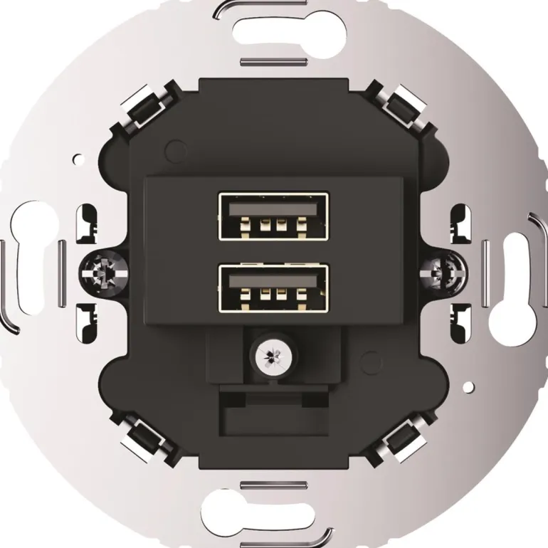 USB-latausliitäntä, jossa 2 A-tyypin USB-liitintä, max 3A (per liitin/yhteensä), ei datasiirtoa, ruuviliitos, 100-240V~, 50/60Hz, 5V= (+/-5%). Erillinen keskialuslevy ei sisälly, viite. 1033xxxx. Sopii R.classic/1930 -sarjan laitteisiin (adapterikehyksellä viite 13820x)
