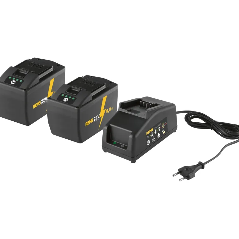 REMS 571592 R220 -latauspaketti ”Power-Pack” sisältää 2 x 21,6 V 9,0Ah -akkua REMS 22V Technology -koneisiin sekä laturin.