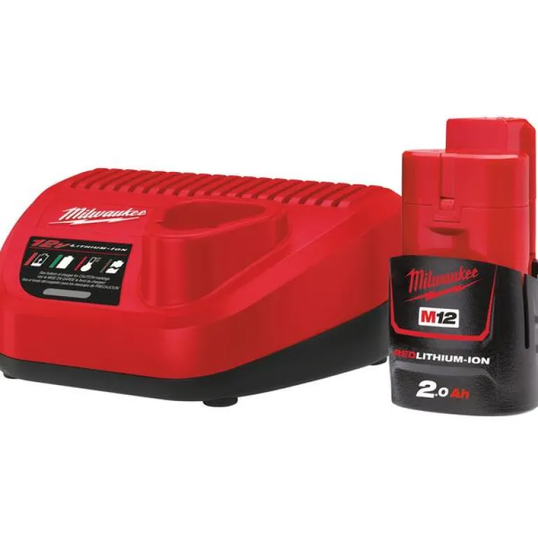 Milwaukee-latauspaketti, joka sisältää yhden 12 V:n ja 2,0 Ah:n Li-ion-akun ja laturin C12C.