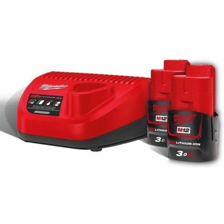 Milwaukeen latauspakkaus sisältää 2 kpl 12V 3,0 Ah litiumioniakkuja ja laturin M12-C12 C.