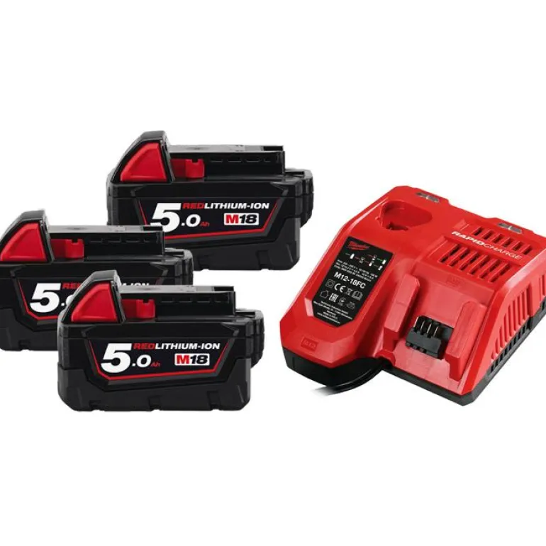 Milwaukee-laturipaketti, joka sisältää 3 kpl 18 V:n ja 5,0 Ah:n Li-ion-akkuja ja pikalaturin M12-18 FC.