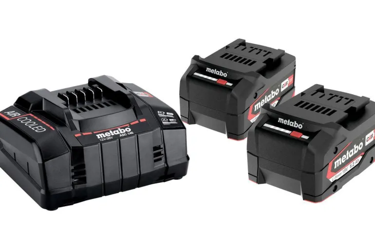 Metabo-latauspaketti, joka sisältää kaksi 18 V:n akkua (5,2 Ah) sekä laturin ASC 30-36 V.