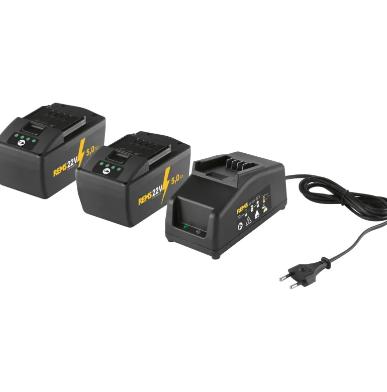 REMS 571591 R220 -latauspaketti ”Power-Pack” sisältää 2 x 21,6 V 5,0Ah -akkua REMS 22V Technology -koneisiin sekä laturin.