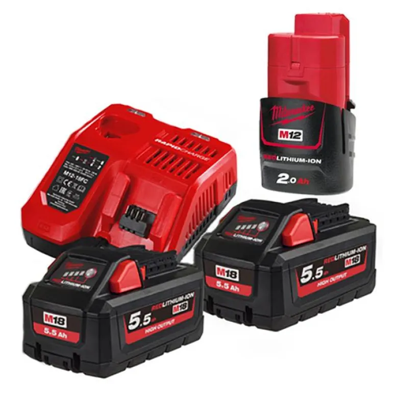 Milwaukee-laturipaketti, joka sisältää 2 kpl 18 V:n ja 5,5 Ah:n akkuja ja laturin.