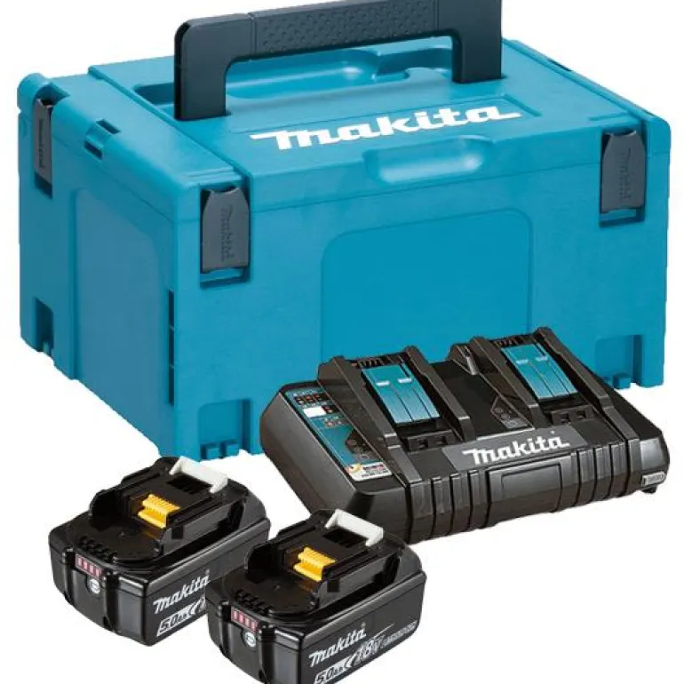 Makita-latauspaketti, joka sisältää seuraavat tuotteet: 2 kpl 18 V:n ja 5,0 Ah Li-ion-akkuja ja akunosoitin, laturi DC18RD ja laukku MAKPAC 3.