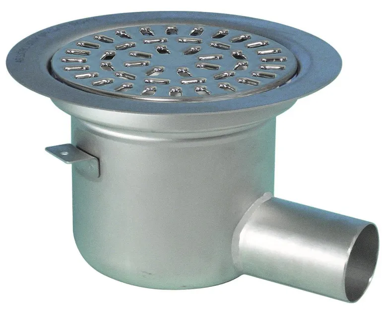 Lattiakaivo ruostumattomasta teräksestä valmistetulla vesilukkoelementillä ja siivilällä. Koko 50 x 150 mm, sivu-ulostulo.