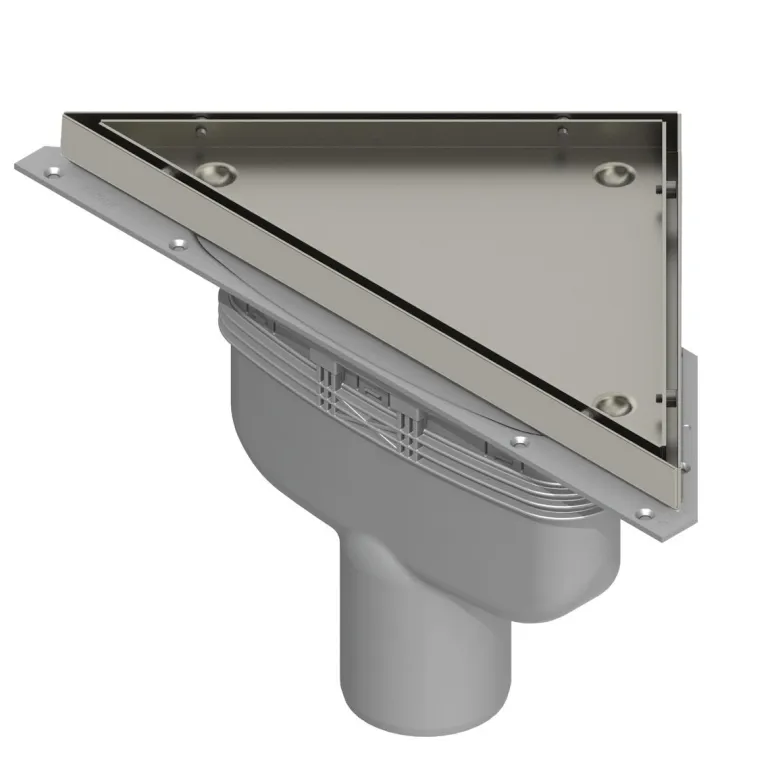 Lattiakaivo asennettavaksi kulmiin, mukana viemärikaivon kehys ja siivilä sekä kiinnitys betoni- ja puulattioille. Koko 75 mm.