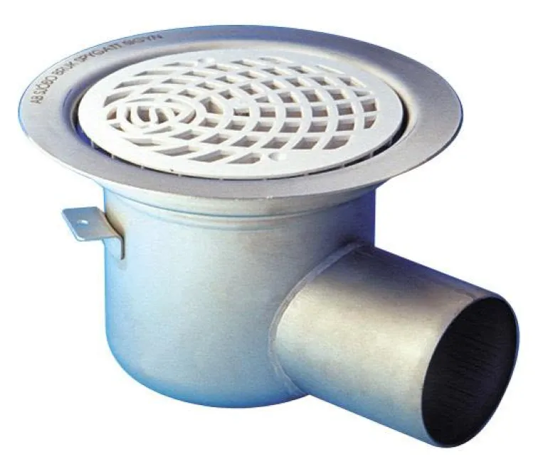 Lattiakaivo, koko 75 x 150 mm, sivu-ulostulo. Mukana toimitetaan sihti, kiristysrengas ja irrotettava vesilukkoelementti.