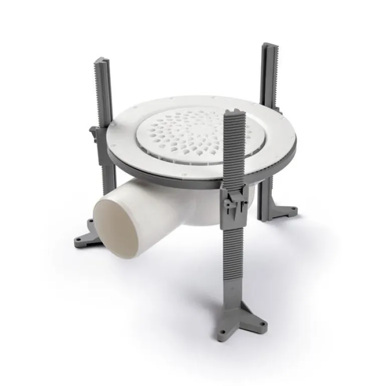 Lattiakaivo, jossa on ritilän halkaisija 150 mm ja sivu-ulostuloaukko, putken ulkohalkaisija ja sileä pää. Toimitetaan tehdasasennetulla asennuskehyksellä betonikiinnitystä tai vastaavaa materiaalia varten. Tukijalat toimitetaan irrallisina muovitetussa yksikössä.