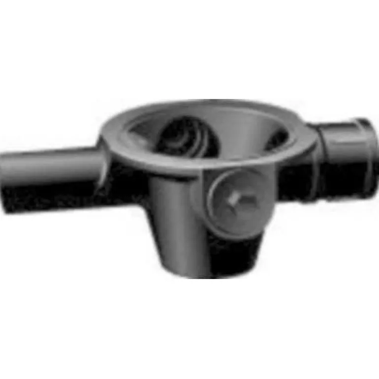 Sisä- ja ulkopäällystetty lattiakaivo sivu-ulostulolla ja säädettävällä tulolla. Kaksi tulppaa ja tuloholkki. 225 x 75 mm.