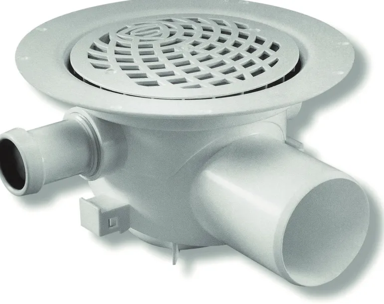 Lattiakaivo sivu-ulostulolla ja 3 ylimääräisellä tuloaukolla. Mallin korkeus 131 mm, ritilän halkaisija 150 mm. Liitetään pistopäällä ja sileällä päällä, valmistettu valkoisesta PP-muovista.