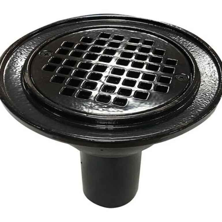 Asfaltoitu valurautainen lattiakaivo, halkaisija 150 mm ja poistoaukon halkaisija 75 mm. Ruuveilla kiinnitetty siivilä ja tiivistelaippa.