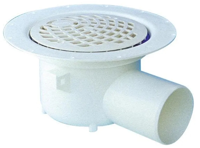Lattiakaivo vaakasuuntaisella ulostulolla ja ritilän halkaisija 150 mm. Mekaanisella hajulukolla, putken ulkohalkaisija 75 mm. Valmistettu valkoisesta PP-muovista.