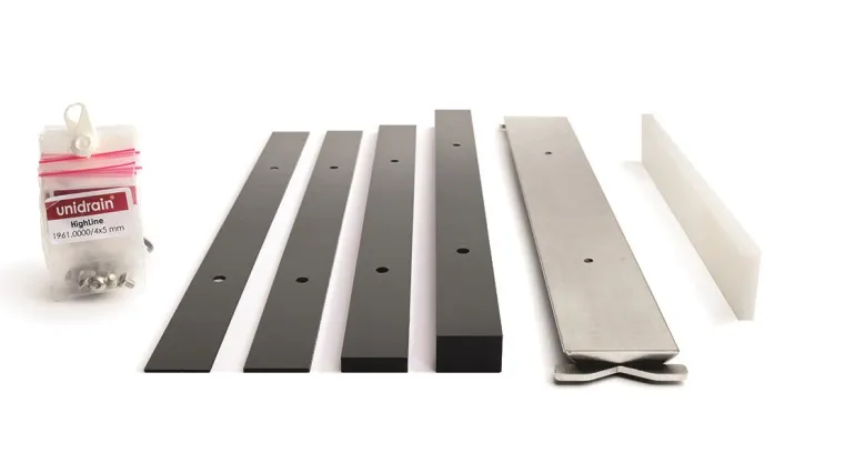 Unidrain Highline Custom 1950 on 300 mm pitkä lattiakaivopaneeli. Sisältää Custom-paneelin, ohjauskiskon, korotussarjan ja oikeanpituiset ruuvit. Kootaan ennen lattiakaivokalusteeseen sijoittamista. Kiskoon liimataan omaa materiaalia, joka on yleensä samaa kuin klinkkerilaatta. Mukana on lisäksi erikoisliimaa omien laattojen liimaamiseen sekä kymmenen 6 mm:n välikappaletta, joita käytetään asennuksessa.