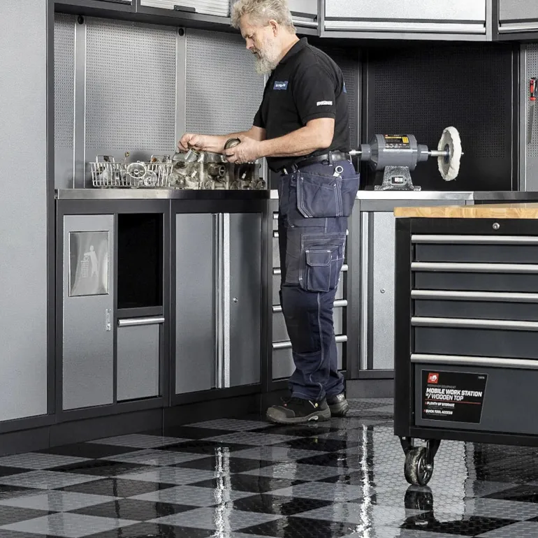 Pela 532218 on lattialaatta autotallin lattiaa varten. Kiiltävä pinta, joka luo autotalliin tai työpajaan showroom-tunnelmaa. Kätevä tapa suojata tai uudistaa tavallisen lattian ilmettä.