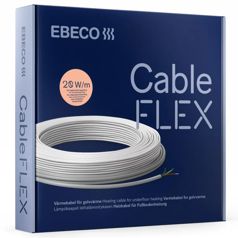 Cableflex on käytännöllinen lattialämmityskaapeli. Pakkaus sisältää kelalla olevan kaapelin, varoituskyltin ja kätevän kelatelineen. Cableflex 20 sopii suuremmalla teholla juoksumetriä kohti erityisen hyvin valuun. Yhdessä raudoitukselle räätälöidyn Ebecon Cable Clip 5 -kaapelikiinnikkeen kanssa tämä järjestelmä säästää paljon aikaa.