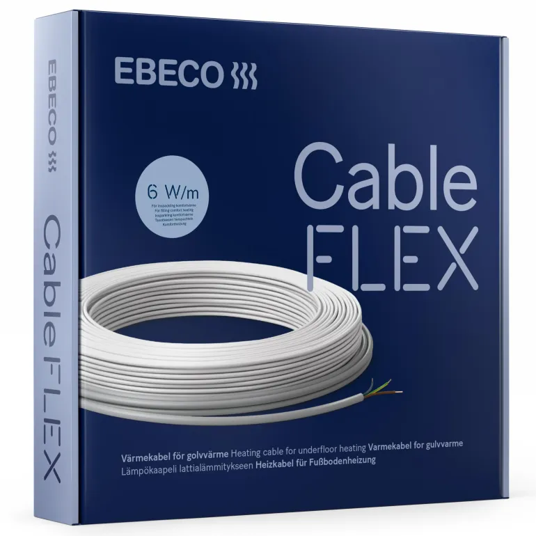 Cableflex on käytännöllinen lattialämmityskaapeli. Pakkaus sisältää kelalla olevan kaapelin, varoituskyltin ja kätevän kelatelineen. Cableflex 6 on erityisesti suunniteltu sisään tasoitukseen mukavuuslämmitystä varten. Kaapeli voidaan hyvin yhdistää Ebecon EB-Therm 500 -termostaattiin, joka sisältää mukavuuslämmityksen ohjelman sisäänrakennetulla enimmäisrajalla.
