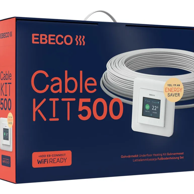 Ebeco Cable Kit 500 on 650 W:n lattialämmityssarja 58 metrin kaapelipituudella. Ebecon kaikkien aikojen energiatehokkain lattialämmityssarja sisältää EB-Therm 500 -termostaatin, jossa on useita säädettäviä energiansäästöohjelmia sekä helppo ja selkeä navigointi. Yhdessä EB-Connect WiFi -lisätarvikkeen kanssa lattialämmitystä voidaan ohjata Ebeco Connect -sovelluksella. Pakkauksessa on kaapeli kelassa, kelapidike, termostaatti EB-Therm 500, kierreletku adapterilla ja liimatangot. Asenna Cable Boardin kanssa, niin vähennät energiankulutusta jopa 35 %.