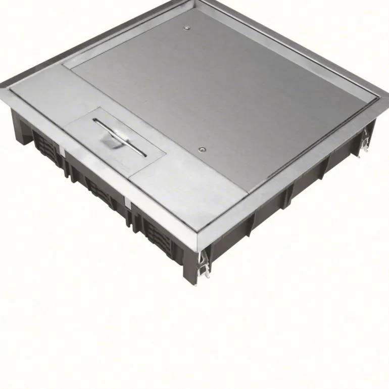 Lattiarasiakansi ruostumattomasta teräksestä Q06 200×200 mm 12 mm lattiapinnoitteelle. Ulkomitat 223×223 mm, min. asennussyvyys 84 mm. Suojamaadoitettujen pistorasioiden määrä 6.