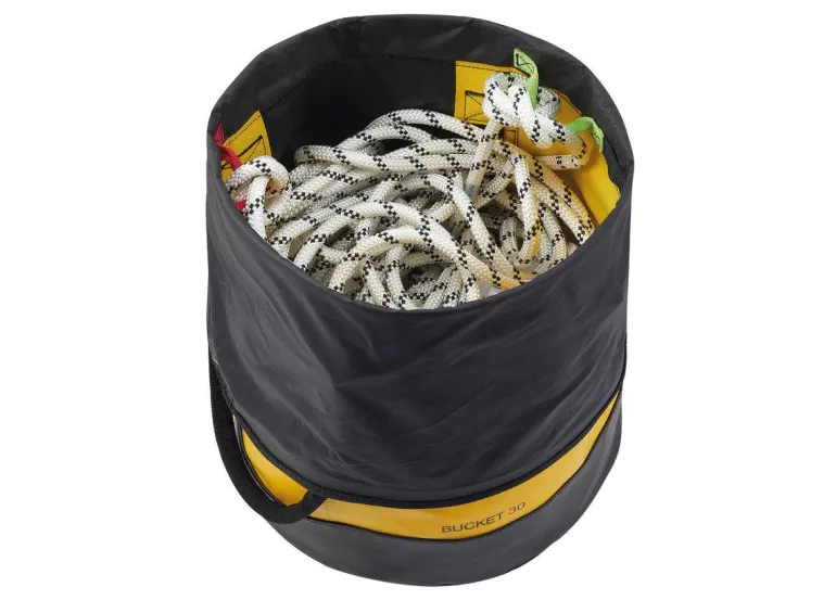 Petzlin köysilaukku, joka on valmistettu kestävästä TPU-materiaalista. Pyöreä muotoilu – pysyy pystyssä ja pitää muotonsa myös tyhjänä. Muotoilu mahdollistaa helpon pääsyn laukun sisältöön. Laukussa on tilaa jopa 110 metrille köyttä (halkaisijaltaan 11 mm). Pehmustetut olkahihnat mukavuuden takaamiseksi, ulkotasku henkilökohtaisten tavaroiden säilyttämiseen ja paikka merkinnöille sisällön nopeaa tunnistamista varten.