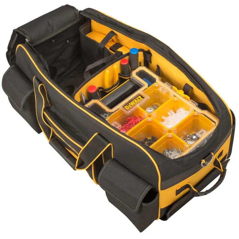 Pyörillä varustettu laukku, 67 litran säilytystila, jonka avulla voit tuoda mahdollisimman paljon tavaraa työpaikalle. Kätevät säilytysratkaisut eri työkalujen helppoon varastointiin. Pohjan muovikisko vähentää kulumista, teleskooppikahva, topattu kangaskädensija ja pehmustettu olkahihna.