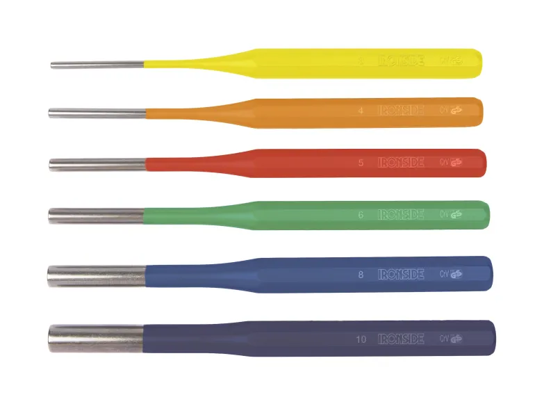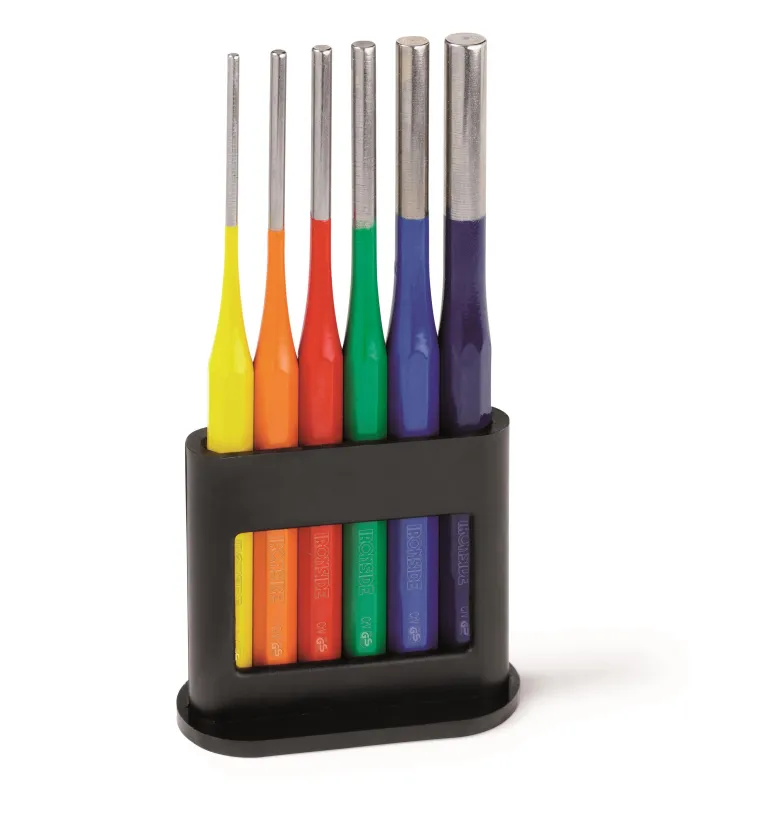 Kromivanadiiniterästä. 59 HRC. Sisältää 6 kpl eri värisiksi maalattuja 150 mm tuurnia, 3, 4, 5, 6, 8, 10 mm. Muovipidike.
