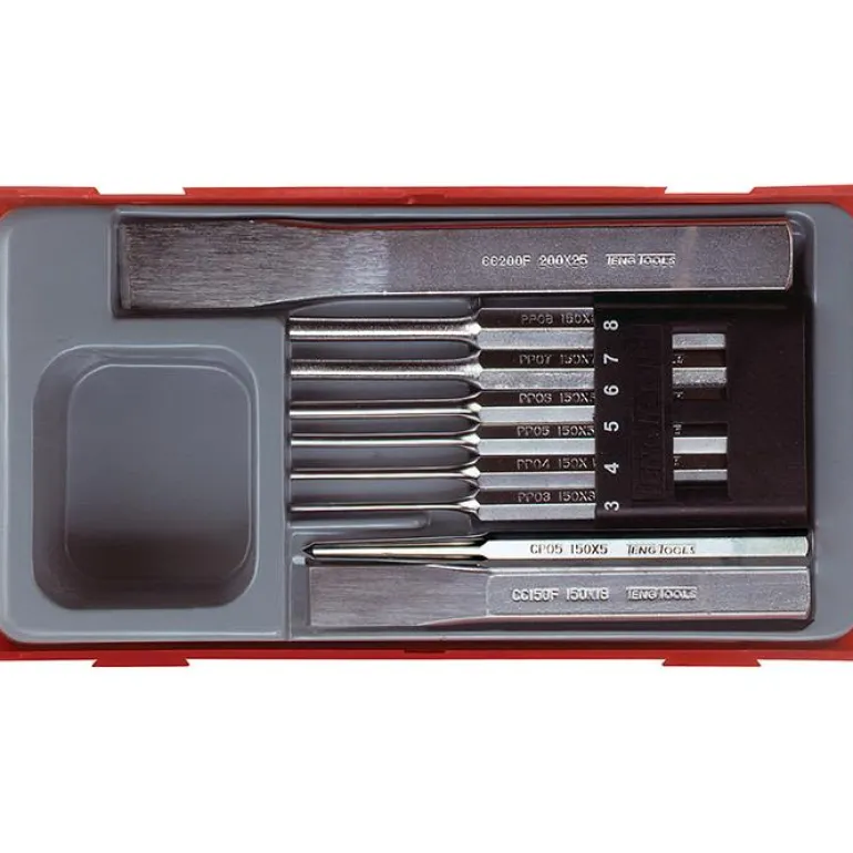 Teng Tools TTPC09 on 9-osainen lävistinsarja, joka sisältää 6 lävistintä, 2 talttaa ja 1 meistin.